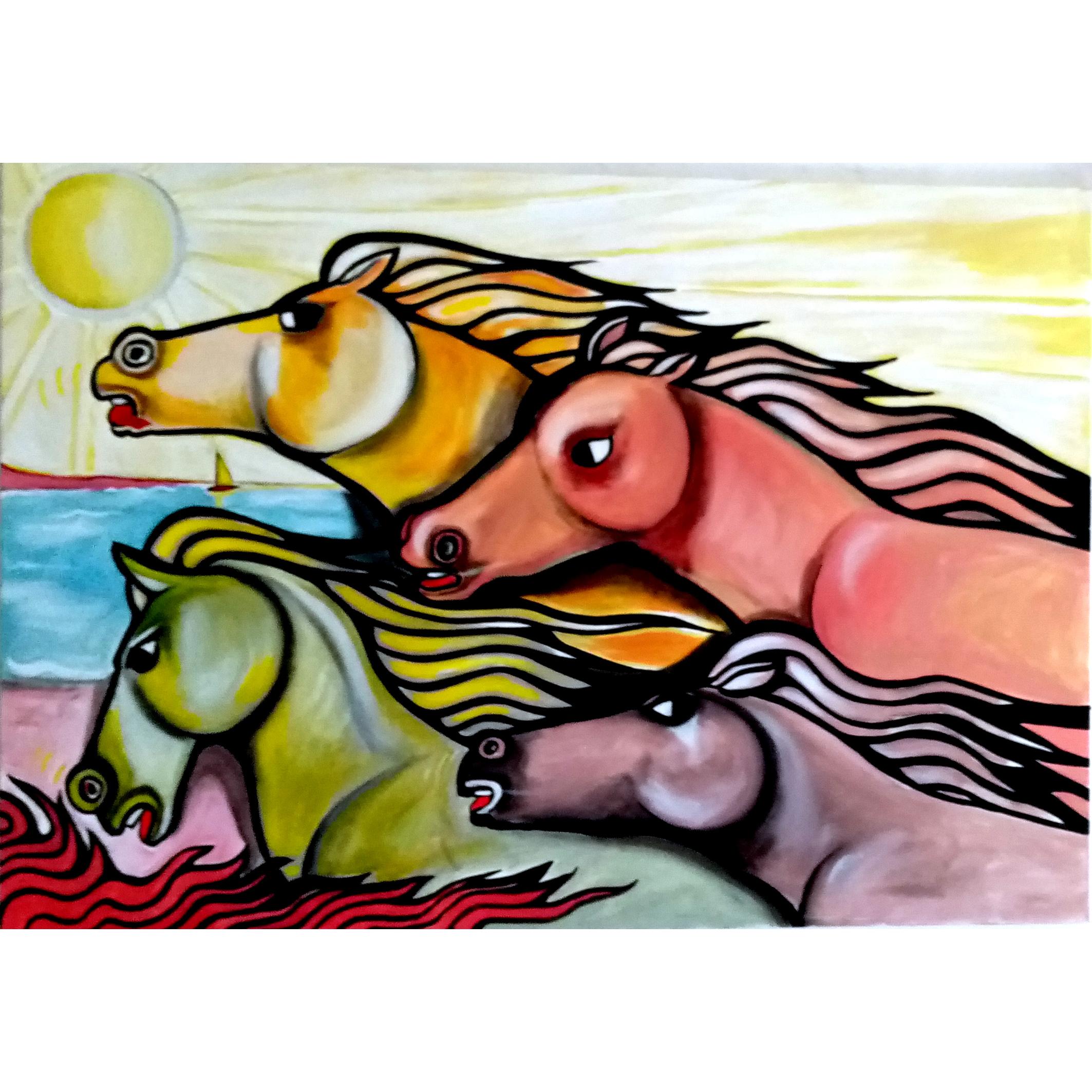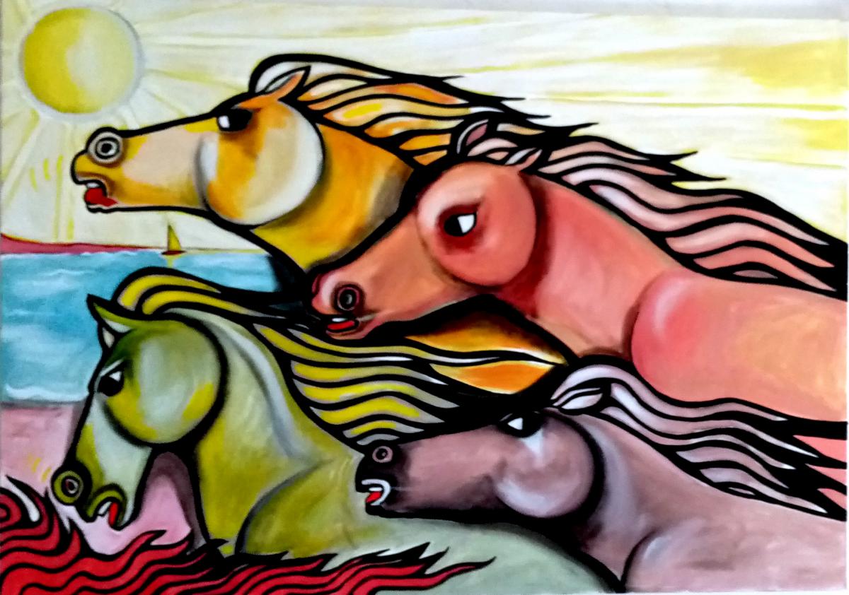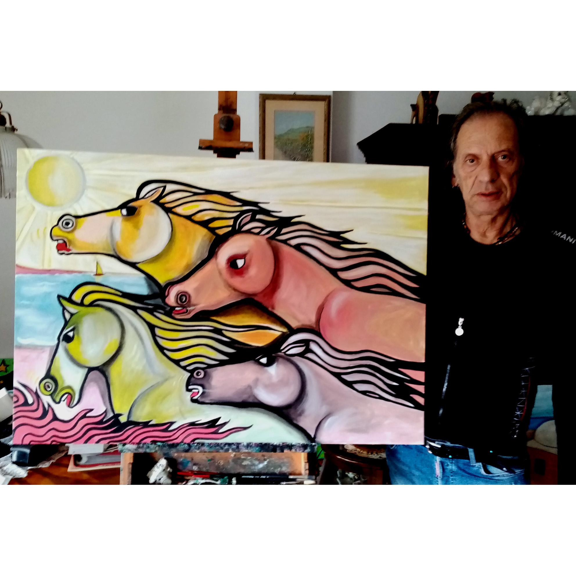 in un galoppo sfrenato i cavalli si sfidano sulla battigia in quella corsa che per loro è naturale. Immagina "classica" del mio lavoro pittorico, che in molte e differenti versioni ha sempre ottenuto il favore del pubblico che mi segue da anni