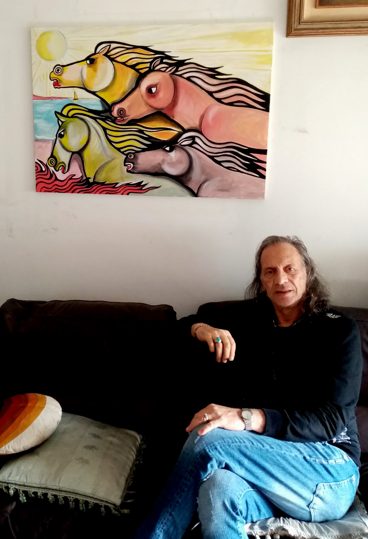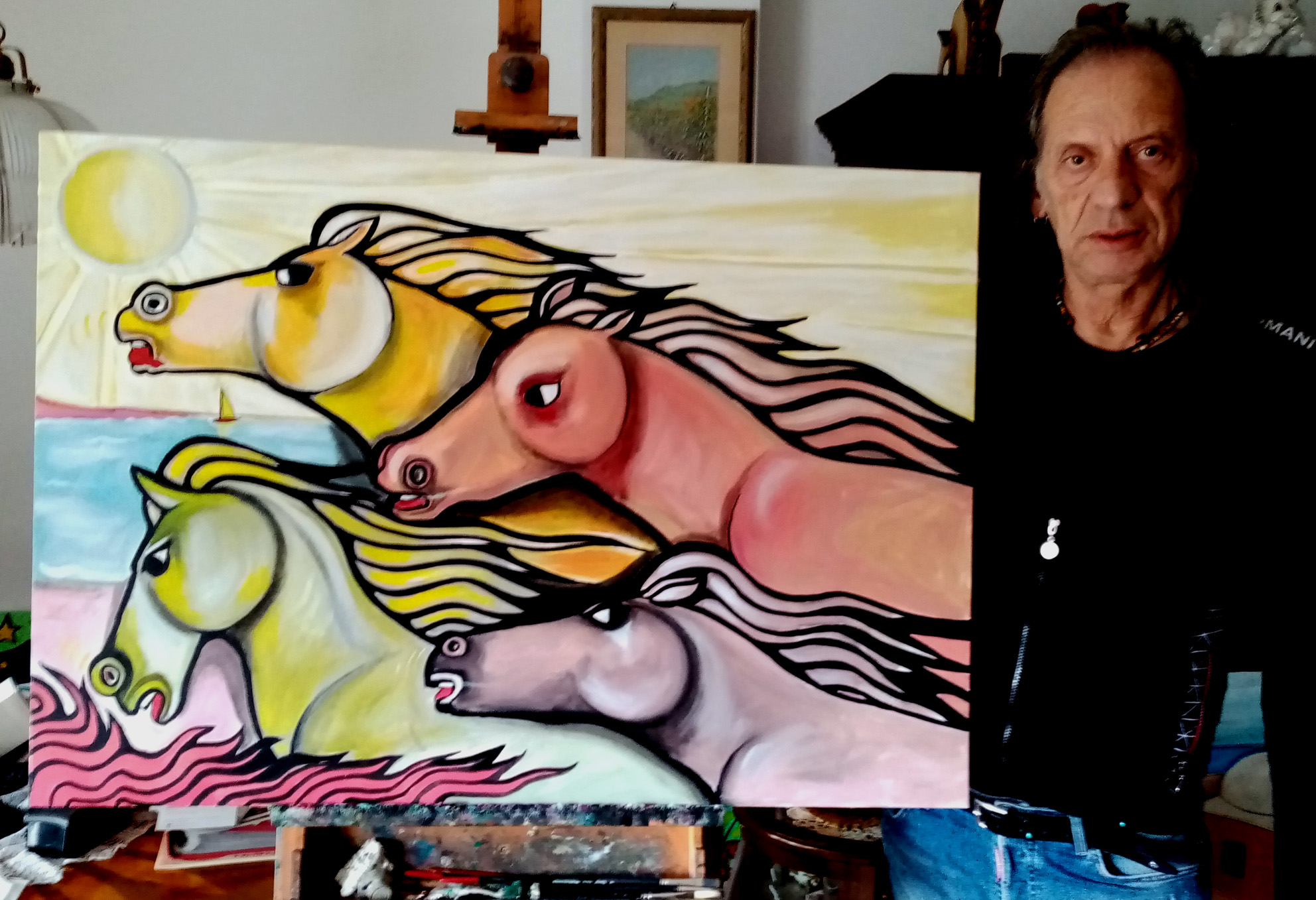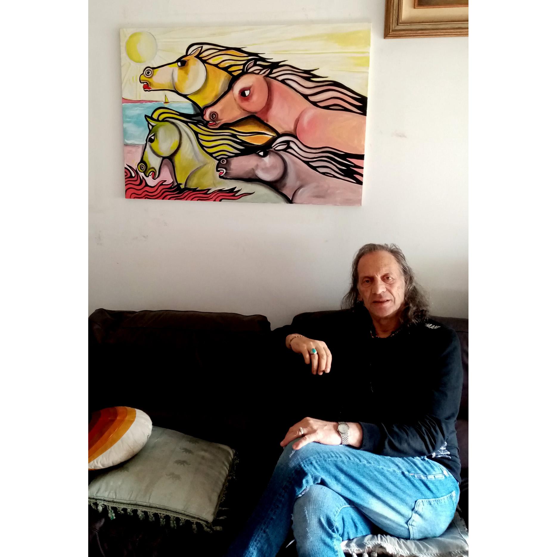 in un galoppo sfrenato i cavalli si sfidano sulla battigia in quella corsa che per loro è naturale. Immagina "classica" del mio lavoro pittorico, che in molte e differenti versioni ha sempre ottenuto il favore del pubblico che mi segue da anni